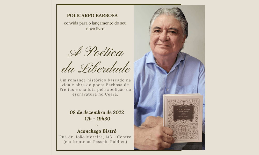O médico e escritor Policarpo Barbosa, lança o romance “Poética da Liberdade” nesta quinta-feira, 8 de dezembro, às 17h, no Aconchego Bistrô, localizado no Museu da Indústria, no Centro, em Fortaleza.