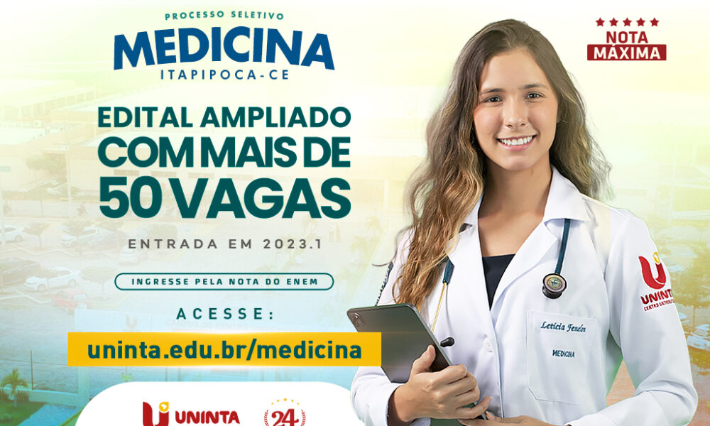 O Ministério da Educação (MEC) ampliou a oferta de vagas para a 4ª entrada do Processo Seletivo do curso de Medicina do Centro Universitário Inta – UNINTA, Campus Itapipoca. As inscrições podem ser efetuadas até o dia 19 de fevereiro de 2023, pelo site uninta.edu.br/medicina