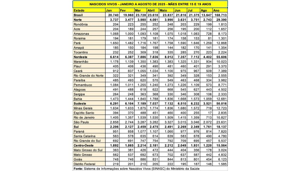 Apesar das campanhas de prevenção à gravidez precoce e do incentivo ao uso de preservativos — medida essencial também para a prevenção de infecções sexualmente transmissíveis (ISTs) —, o país segue enfrentando números expressivos. Entre janeiro e agosto de 2025, o Brasil registrou 168.713 nascimentos de bebês, filhos de mães com idades entre 15 e 19 anos, segundo dados do Sistema de Informações sobre Nascidos Vivos (Sinasc) do Ministério da Saúde, compilados em 27 de janeiro de 2026 pela Organização Nacional de Acreditação (ONA). Já em 2024, entre janeiro e agosto, foram 179.428 nascimentos, totalizando 261.206 ao final do ano.